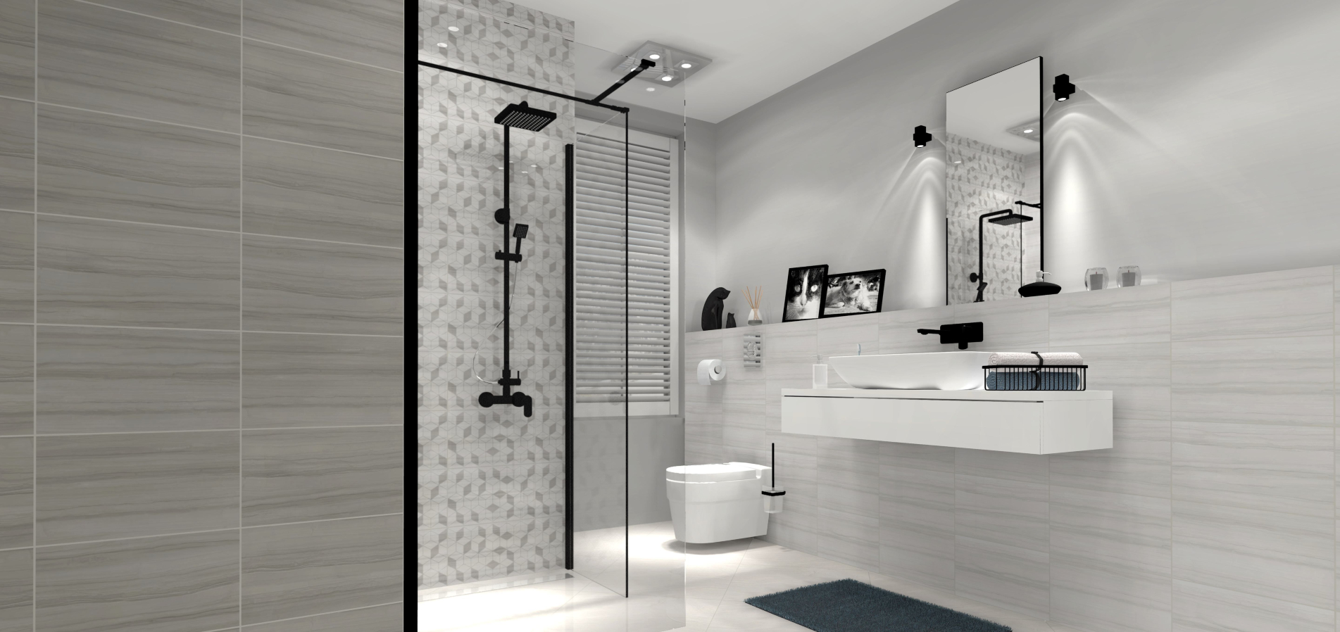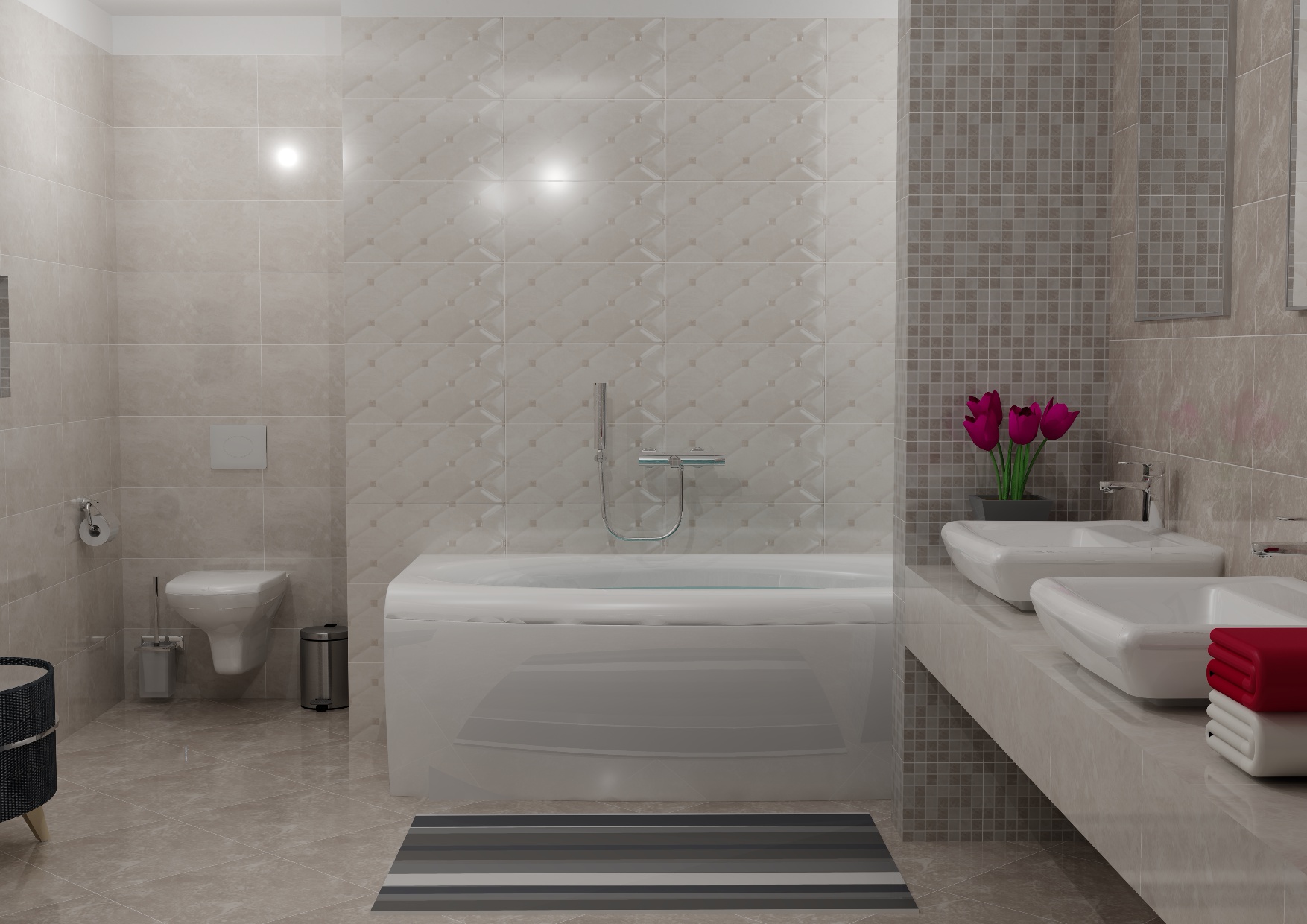 Koupelny v klasickém rozměru v designu mramoru, dřeva a různých barevných odstínech
