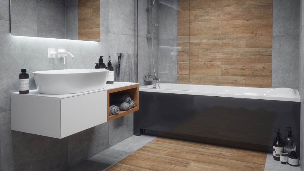 Velkoformátová obklad v designu mramoru do kombinace se dřevem.