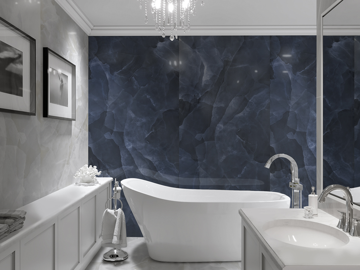 Velkoformátový obklad a dlažba v medových barvách mramoru.